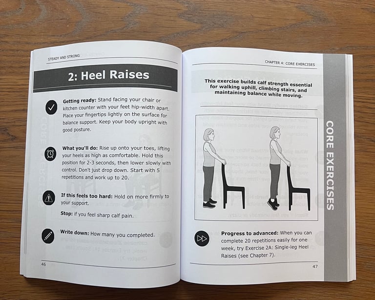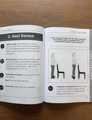 Steady & Strong is a 12-week fall prevention program developed by a physical therapist with over 25 years of clinical experience. This book provides evidence-based exercises you can do at home using only a chair and wall space.